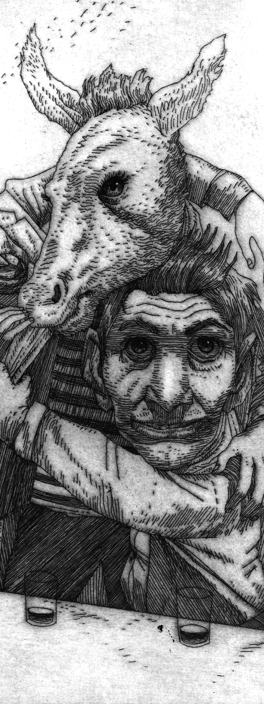 Om meer verdieping in mijn tekenwerk te verkrijgen ben ik al experimenterend gestuit op het etsen. Deze techniek biedt de mogelijkheid om nog verfijnder te kunnen werken. Ook al is het een dankbare techniek die veel aangename verrassingen oplevert, moet ik mijn hoofd er gedurende elk onderdeel – voorbereidingen, zuren en afdrukken – bij houden. Het resultaat is inmiddels een reeks gedetailleerde voorstellingen die handelen over mijn vaste thema’s – de fantasie als vlucht voor het kind, dronkaards en eenzaamheid. Alhoewel de oplage beperkt is, zijn de etsen – zolang voorradig – te koop. Prijs op aanvraag.
